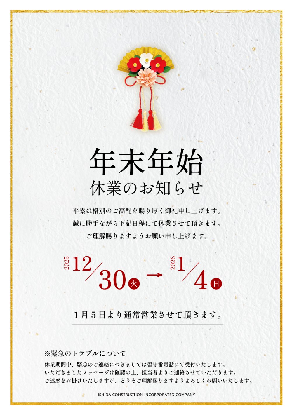 石田建設(株)では下記の期間、年末年始休業とさせて頂きます。